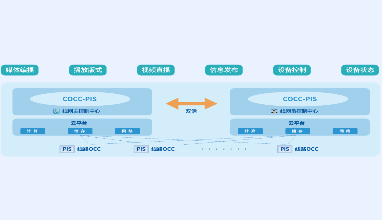 1、场景特点:整体线网公共媒体信息控制管理,通常采用城轨云安全生产网云化部署方式,对接控制管理线路级/场站/列车PIS系统,具备最高PIS管理权限和最高播放显示级别